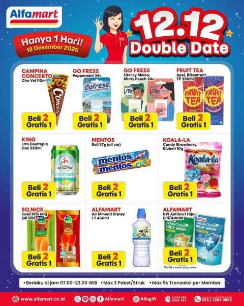 Dilansir dari @alfamart di Instagram, promo 12.12 ini siapkan beli 1 gratis 1 dan beli 2 gratis 1 untuk Anda.