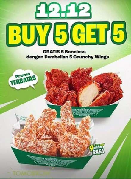 Promo 12.12 di Wingstop siapkan beli 5 gratis 5 yaitu beli 5 crunchy wings dan dapatkan gratis 5 boneless.