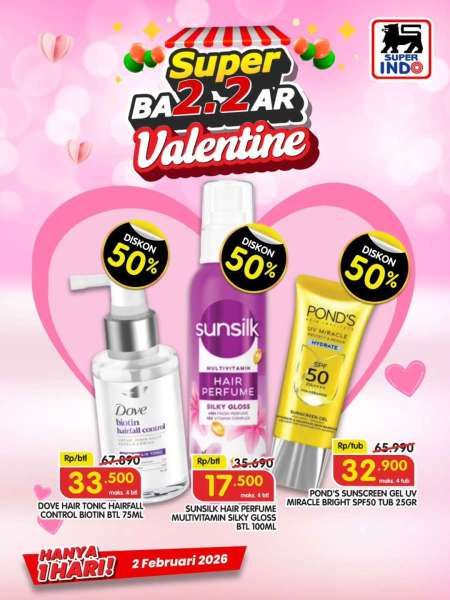 Jangan lewatkan juga promo 2.2 Superindo diskon serba 50% untuk produk tertentu spesial menjelang Hari Valentine.