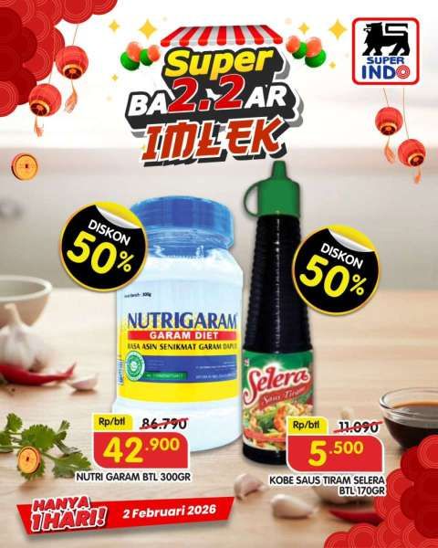 Di promo 2.2 Superindo menjelang Imlek ada Nutri Garam 300 gram Rp 42.900 dan Kobe saus tiram Selera Rp 5.500.