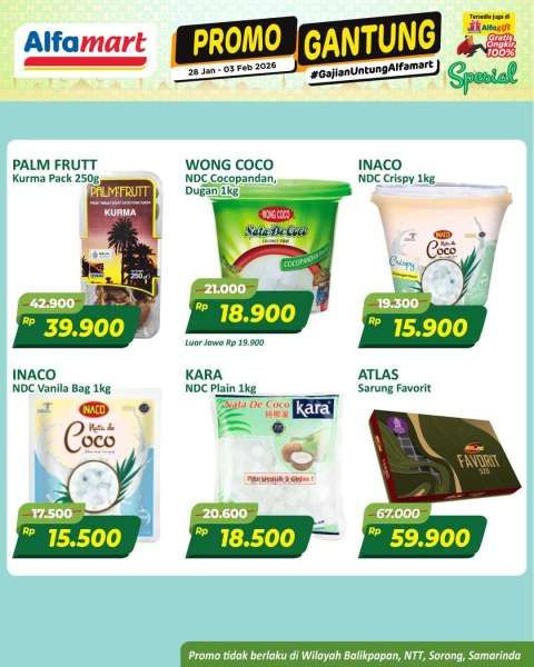 Ada kurma Palm Frutt hingga First Dates, nata de coco Wong Coco, Inaco, sarung Atlas, Fox, Yupi, dan Coca-Cola hemat.