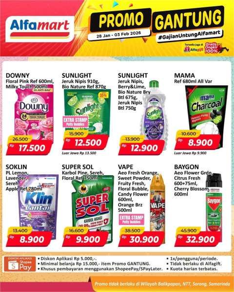 Dapatkan Daia 1,5 kg Rp 24.900, Vanish Rp 19.900, Downy Rp 20.900, Sunlight mulai Rp 12.500, dan Mama Lemon Rp 8.900.