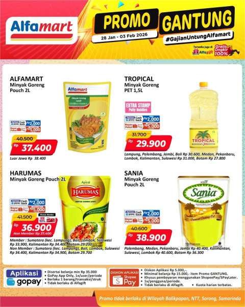 Perhatikan harga minyak goreng di katalog promo Alfamart gantung yang berbeda-beda di berbagai wilayah.