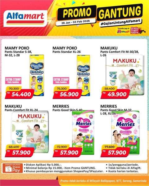 Jangan lewatkan promo popok bayi Sweety, Mamy Poko, Makuku, Merries mulai Rp 47.000-an di Alfamart gantung.