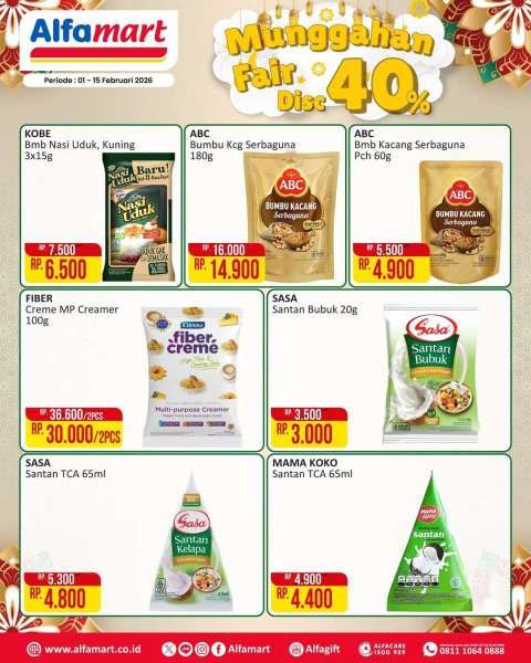 Promo Alfamart munggahan menyediakan diskon Santan. Ada Sasa bubuk Rp 3.000, Sasa cair Rp 4.800, dan Mama Koko Rp 4.400.