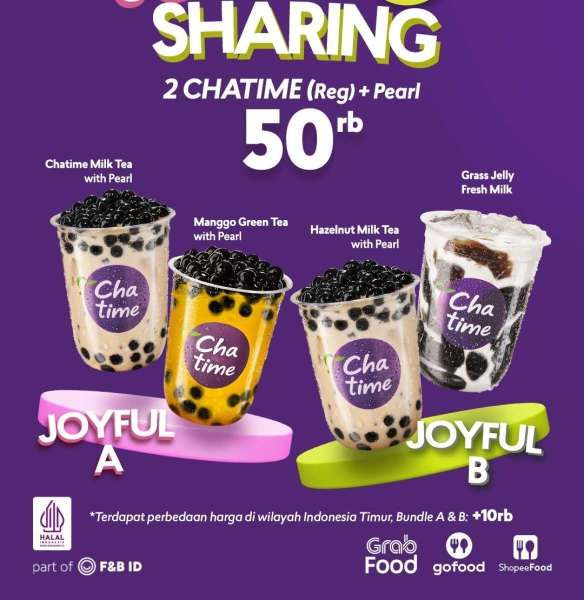 Ada paket Chatime joyful B berisi hazelnut milk tea with pearl dan grass jelly fresh milk Rp 50.000 juga.