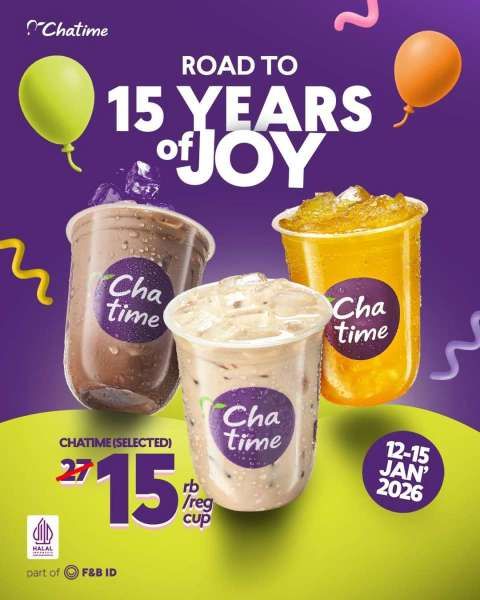 Promo Chatime anniversary yang ke-15 tersebut berlaku selama 4 hari dari tanggal 12-15 Januari 2026.