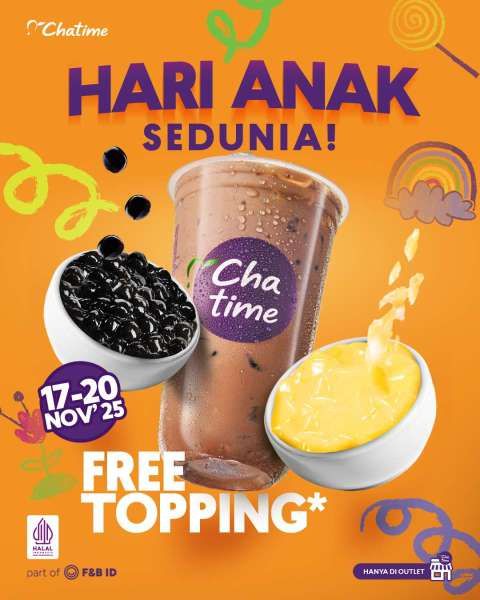 Promo Chatime Hari Anak Sedunia di November 2025 siapkan gratis topping untuk anak-anak.