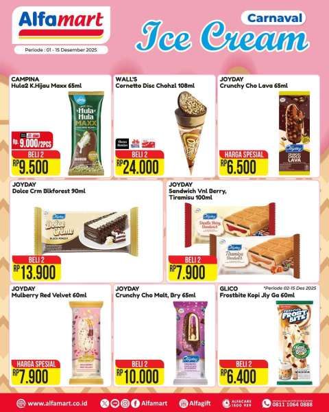 Promo es krim di Alfamart terbaru bulan Desember ini hadirkan Campina, Joyday, dan Glico beli 2 harga spesial.
