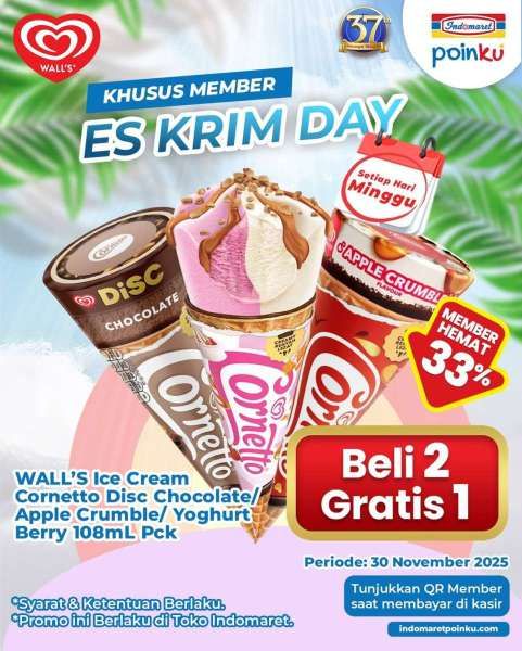 Dapatkan es krim cornetto Wall's beli 2 gratis 1 atau diskon 33% yang berlaku hanya hari ini pada Minggu, 30 November 2025.