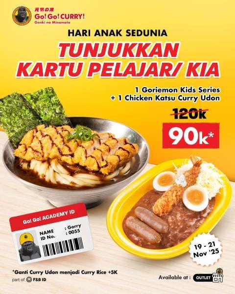 Dapatkan promo Go Go Curry Hari Anak Sedunia dengan menunjukkan kartu pelajar atau Kartu Identitas Anak (KIA).