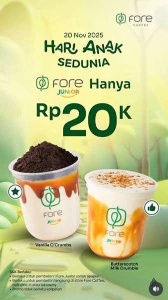 Promo Fore Coffee spesial Hari Anak Sedunia yang pertama ada Fore junior cuma Rp 20.000 saja.