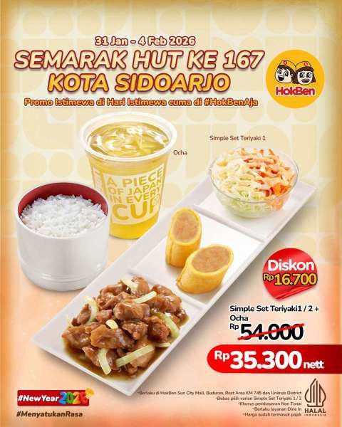Dapatkan menu simple set teriyaki 1 atau 2 ditambah minuman ocha di promo HokBen HUT Kota Sidoarjo 2026 ini.