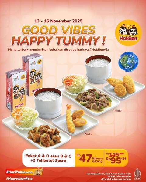 Dapatkan promo HokBen Hari Kebaikan Sedunia ini yang berlaku mulai tanggal 13-16 November 2025 nanti.