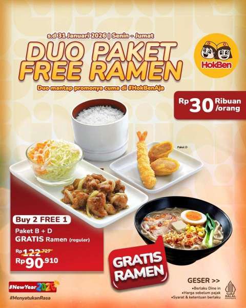 Ada beli 2 gratis 1 ramen yang berlaku di HokBen sampai tanggal 31 Januari 2026 mendatang.
