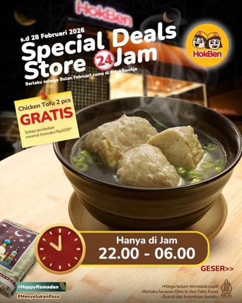 Promo HokBen store 24 jam gratis chicken tofu berlaku hingga tanggal 28 Februari 2026 mendatang.