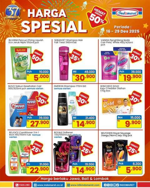 KONTAN.CO.ID - Promo Indomaret harga spesial terbaru 16-29 Desember 2025 menyiapkan harga hemat. Ada deterjen dan sabun mandi hemat sampai 50%.
