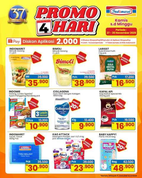 Harga spesial juga hadir untuk tisu Indomaret Rp 30.900 dan deterjen Kao Attack 1,5 kg harga Rp 23.900.