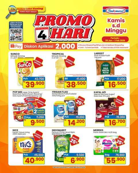 Dapatkan juga tisu Nice 2000 helai Rp 40.900, sabun pencuci piring Indomaret Rp 6.900, dan Merries XL Rp 55.900.