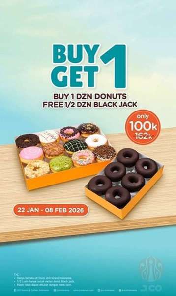 Promo J.CO terbaru di bulan Januari 2026 menyiapkan paket beli 1 lusin donut gratis 1/2 lusin donut Black Jack.