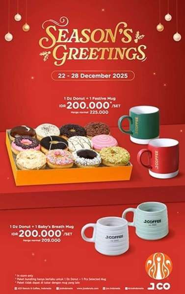 Promo J.CO paket donut dan cangkir spesial ini bisa didapatkan mulai tanggal 22-28 Desember 2025.