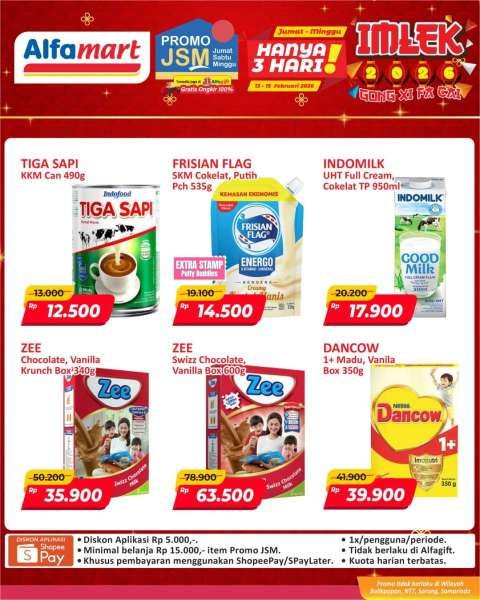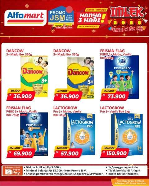 Ada potongan harga juga untuk susu Zee, Dancow, Frisian Flag, Lactogrow, Chil Go, Chil Kid, dan Anlene di JSM Alfamart.