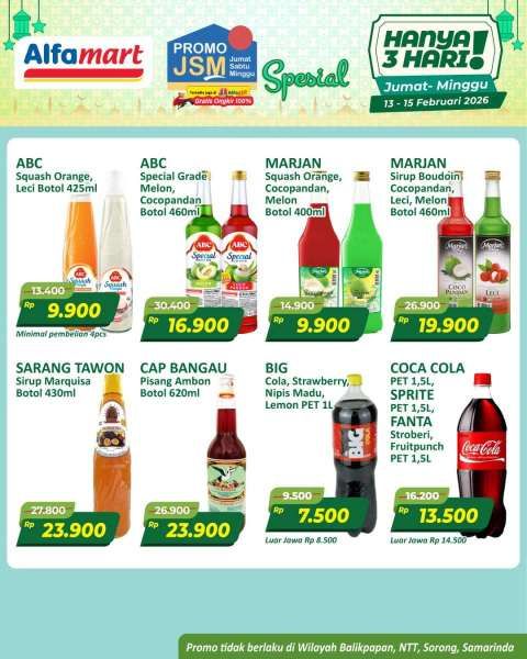 Promo JSM Alfamart di akhir pekan ini tidak berlaku di wilayah Balikpapan, NTT, Sorong, dan Samarinda.