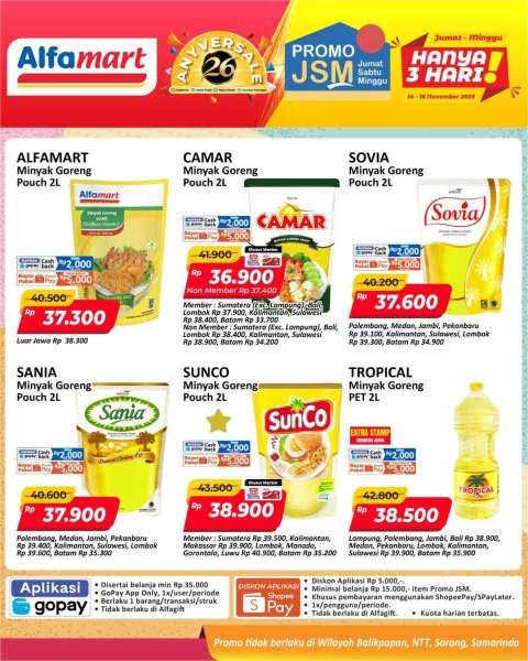 Dapatkan minyak goreng Alfamart, Camar, Sovia, Sania, Sunco dan Tropical 2 liter mulai Rp 37.000-an saja.