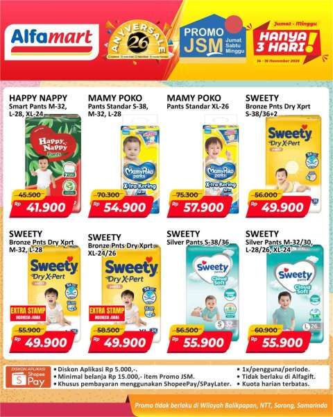 Promo JSM Alfamart juga siapkan potongan harga untuk popok bayi Sweety dan Happy Nappy mulai Rp 41.000-an.