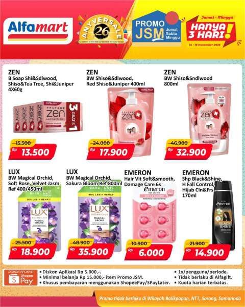 Di promo JSM Alfamart terbaru dapatkan Lux 400 ml Rp 18.900, Zen 400 ml Rp 17.900 dan Emeron Rp 14.900.