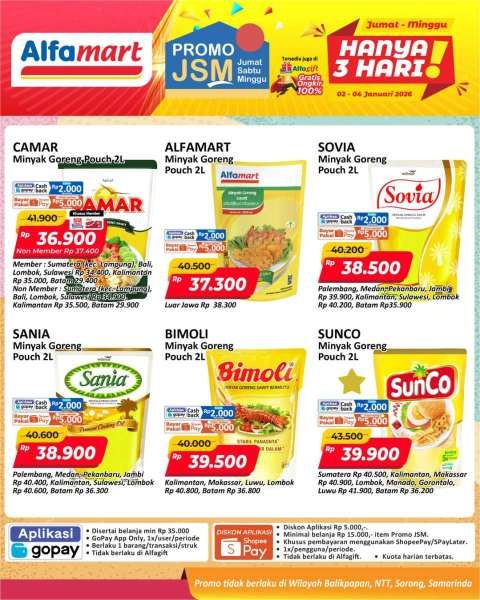 Ada promo minyak goreng Camar, Alfamart, Sovia, Sania, Bimoli, dan Sunco harga mulai Rp 37.000-an.