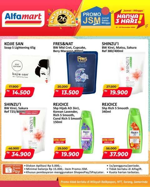 Dapatkan sabun Kojie San Rp 14.500, Fres & Nat Rp 13.500, Shinzu'i Rp 19.900 dan shampoo Rejoice mulai Rp 19.900.