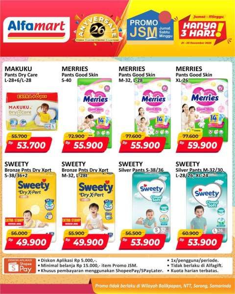 Selanjutnya di promo JSM Alfamart dapatkan Mamy Poko, Makuku, Happy Nappy, Merries dan Sweety lebih hemat.