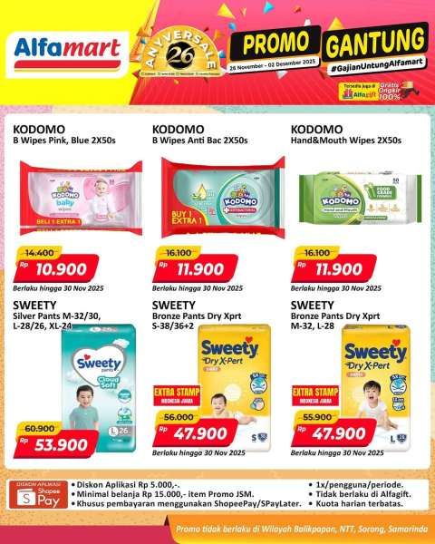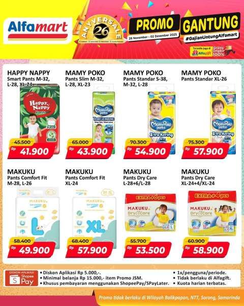 Di promo JSM Alfamart gantung ada popok bayi Sweety, Happy Nappy, Mamy Poko dan Makuku lebih hemat.
