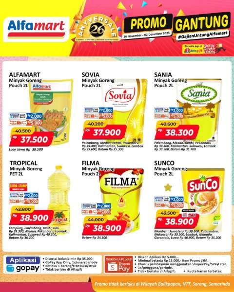 Belanja minyak goreng Alfamart, Sovia, Sania, Tropical, Filma, dan Sunco harga mulai Rp 37.000-an di akhir bulan ini.