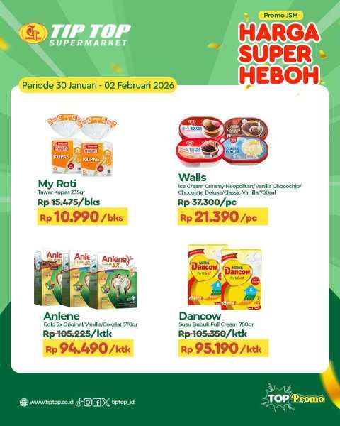 Di promo JSM Tip Top ada susu Anlene 570 gram Rp 94.490, Dancow 780 gram Rp 95.190, dan My Roti Rp 10.990.