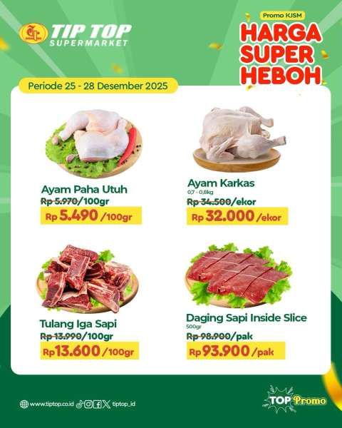 Di promo JSM Tip Top terbaru bulan Desember 2025, ada ayam paha utuh Rp 5.490/100 gram dan ayam karkas Rp 32.000.