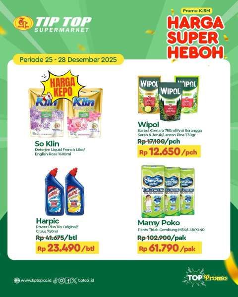 Promo JSM Tip Top juga memberikan potongan harga untuk Cussons baby wipes, Mamy Poko, Harpic, Wipol, dan Kin yogurt.
