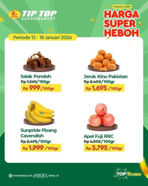 Ada buah salak pondoh, jeruk kino Pakistan, apel fuji,dan pisang Sunpride di promo JSM Tip Top long weekend.