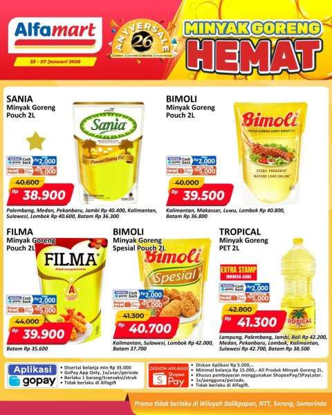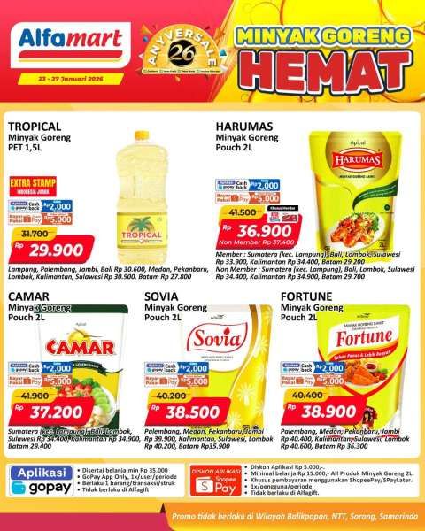 Promo minyak goreng hemat di Alfamart tersebut tidak berlaku untuk wilayah Balikpapan, NTT, Sorong, dan Samarinda.