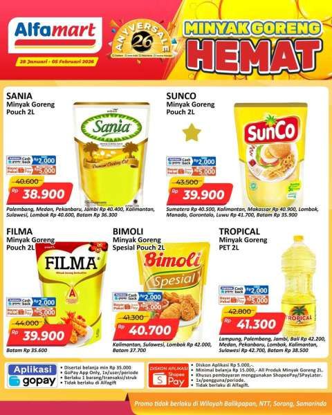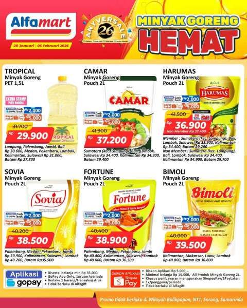 Promo minyak goreng hemat di Alfamart tersebut tidak berlaku di Balikpapan, NTT, Sorong, dan Samarinda.