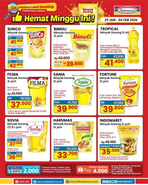 Dapatkan juga Fortune Rp 38.100, Sovia Rp 35.900, Harumas Rp 36.400, dan minyak goreng Indomaret Rp 33.800.