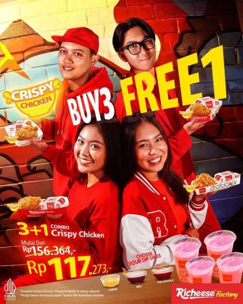 Dikutip dari @richeese_factory di Instagram, ada beli 3 gratis 1 untuk combo crispy chicken.