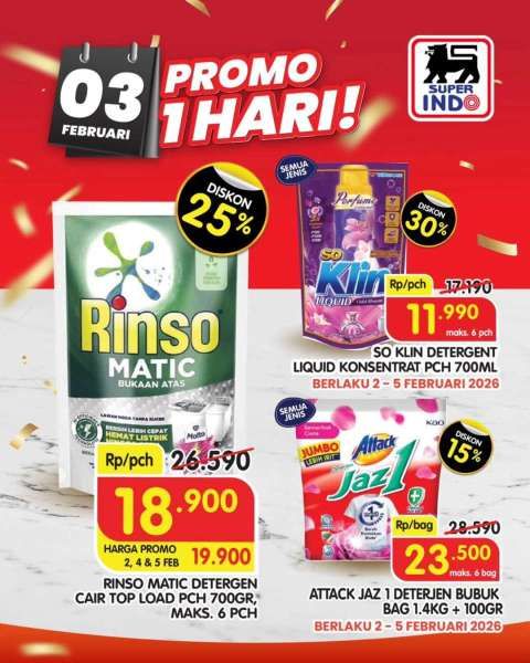 Ada potongan harga juga untuk promo deterjen So Klin cair 700 ml atau Attack Jaz 1 bubuk 1,4 kg di Superindo.