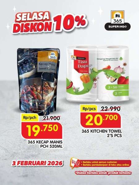 Dapatkan diskon 10% juga untuk kecap manis 520 ml dan 365 kitchen towel di promo Superindo hari ini.