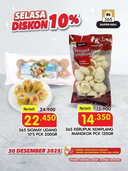 Belanja 365 kerupuk kemplang mangkok 120 gram lebih murah dari Rp 15.900 menjadi Rp 14.350 di Superindo.