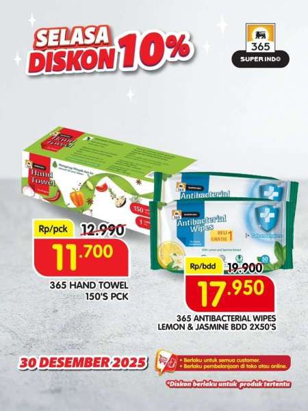 Beli 365 lada putih bubuk 50 gram Rp 16.050, 365 hand towel Rp 11.700, dan 365 antibacteria wipes Rp 17.950.