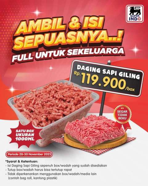 Selain itu ada daging sapi giling satu kotak dengan harga spesial Rp119.900 saja di Superindo akhir bulan.