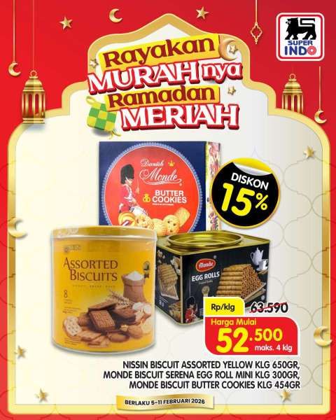 Promo Superindo sambut Ramadan menawarkan Monde butter cookies, Nissin Assorted, dan Monde egg roll diskon 15%.