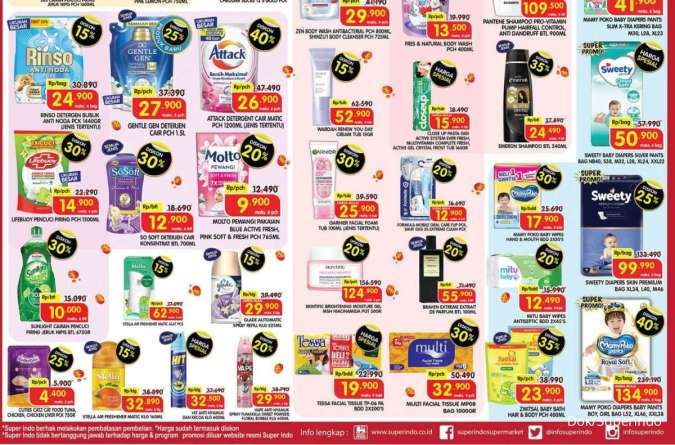 Dapatkan Mamy Poko Rp 41.900, Sweety Rp 50.900, Mitu Rp 12.490, sabun Zwitsal Rp 23.900 dan Cussons hair lotion diskon 30%.